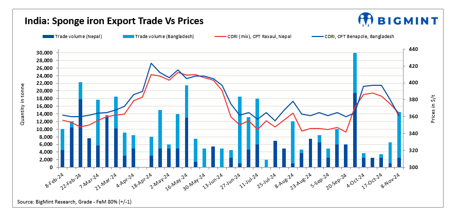 Export deals for about 14,500 t of sponge iron were concluded for Nepal and Bangladesh this week, amid muted market sentiments.