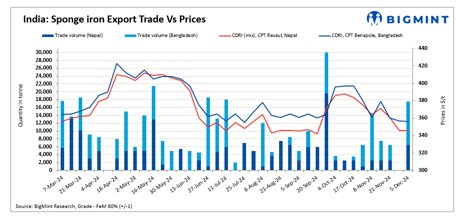 Sponge iron export deals for approximately 17,500 t were confirmed for Nepal and Bangladesh this week. The volume reflects increased procurement w-o-w from India, amid market volatility.
