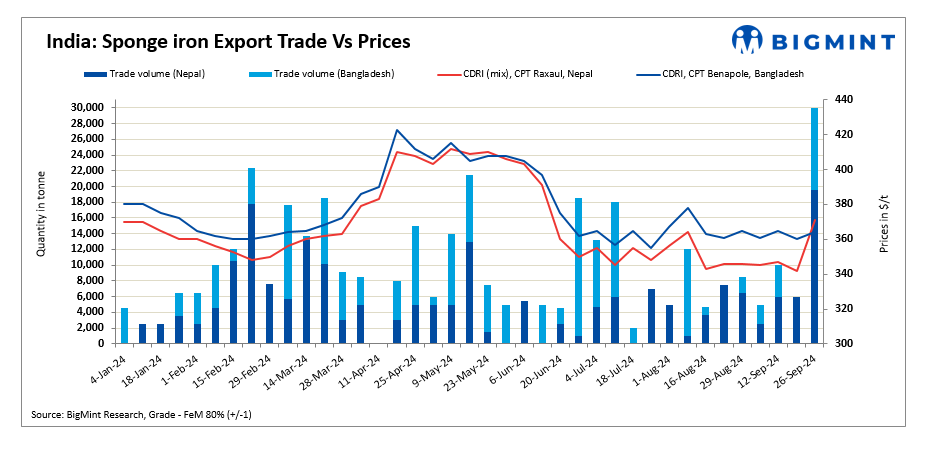 As per BigMint’s weekly assessment, sponge iron export offers increased significantly by $4-$29/t w-o-w amid fluctuations in domestic market sentiments and prices of the material. Approximately 19,500 t of sponge iron were sold to Nepal and 10,500 t to Bangladesh, with Nepal’s export prices surging to $371/t CPT Raxaul and Bangladesh’s to $364/t CPT Benapole. A rise in buying activity supported the increase in offers.