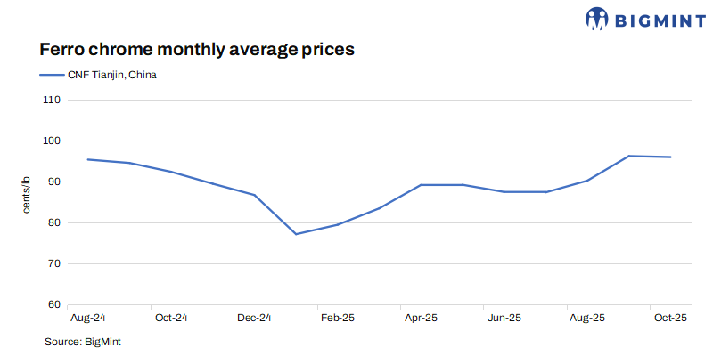 Indian ferro chrome export prices to China fell by 2 cents/lb w-o-w to 94 cents/lb CNF. Export activity remained subdued drop fall in Chinese domestic prices due to ample inventory. Meanwhile, export prices to Japan fell by 3 cents/lb to 103 cents/lb CNF, with no spot inquiries as buyers were booking long-term. Offers to South Korea also eased by 2 cents/lb to 102 cents/lb CNF.