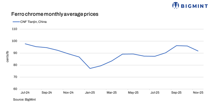 Indian ferro chrome export prices to China held firm at 91 cents/lb CNF on 26 November, on par with prices reported in the previous week, supported by improving buying interest following recent Chinese steel mill tender prices. Export offers to Japan also held steady w-o-w at 103 cents/lb CNF, while prices to South Korea edged down by 1 cent/lb to 102 cents/lb CNF.