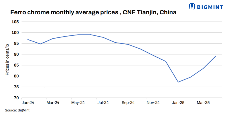 Indian ferro chrome export prices to China remained steady w-o-w at 91 cents/lb CNF, despite weak domestic tags and sluggish demand. Offers to Japan edged down by 2 cents/lb w-o-w to 91 cents/lb CNF, while prices to South Korea held steady at 92 cents/lb CNF. In Japan, demand was subdued due to the ongoing Golden Week holidays, with buyers in no rush to procure material.