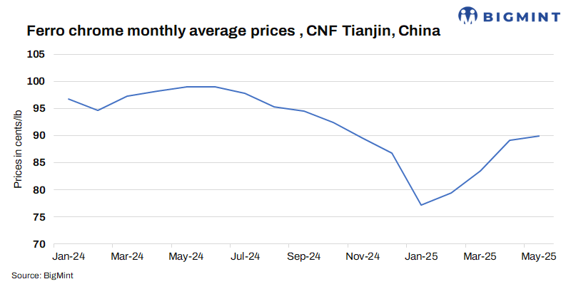 Indian ferro chrome export prices to China remained steady w-o-w at 89 cents/lb CNF, primarily due to the stability in domestic tags. Tsingshan’s tender prices for Jun’25 deliveries too remained unchanged m-o-m at RMB 8,095/t DAP, including taxes. In addition, offers to Japan and South Korea were stable w-o-w at 93 cents/lb and 91 cents/lb CNF, respectively.