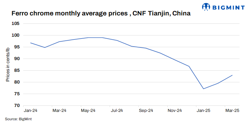 Indian ferro chrome export prices to China remained stable w-o-w at 83 cents/lb CNF. However, bids from stainless steel producers in China were lower against the domestic and Indian spot offers. Offers for Japan held steady too w-o-w at 90 cents/lb CNF, though demand stayed weak, as mills were not in a rush to book material.