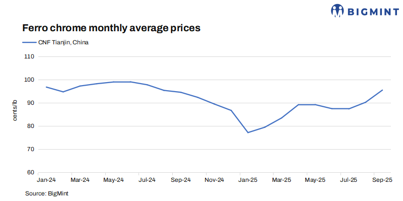 Indian ferro chrome export prices to China rose by 3 cents/lb w-o-w to 97 cents/lb CNF. However, trading stayed limited as domestic Chinese prices remained competitive. Prices to Japan increased by 5 cents/lb to 103 cents/lb CNF, driven by tight spot market supply, while prices to South Korea rose 4 cents/lb w-o-w to 102 cents/lb CNF.