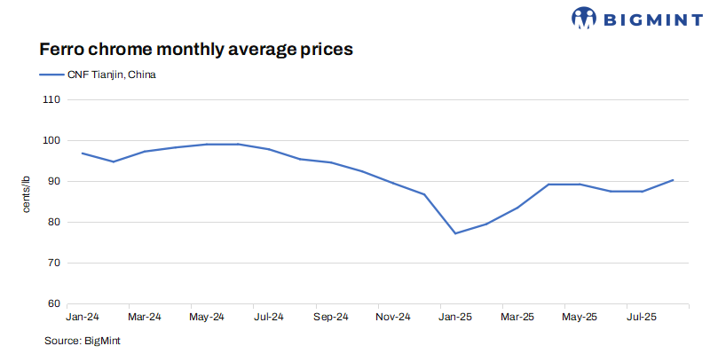 Indian ferro chrome export prices to China increased by 4 cents/lb w-o-w to 94 cents/lb CNF, driven by higher Tsingshan tender prices for Sep’25 and rising Chinese domestic prices. Prices to Japan climbed 7 cents/lb to 98 cents/lb CNF, despite subdued spot trading and limited buyer interest, while prices to South Korea rose 4 cents/lb w-o-w to 96 cents/lb CNF.