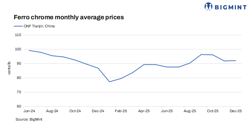 Indian ferro chrome export prices to China inched up by 2 cents/lb w-o-w to 93 cents/lb CNF on 10 Dec’25. However, in China, rising stainless steel inventories and weak seasonal demand prompted production cuts. Prices for Japan eased by 3 cents/lb to 99 cents/lb CNF on soft market sentiment, while offers to South Korea held steady at 100 cents/lb CNF.