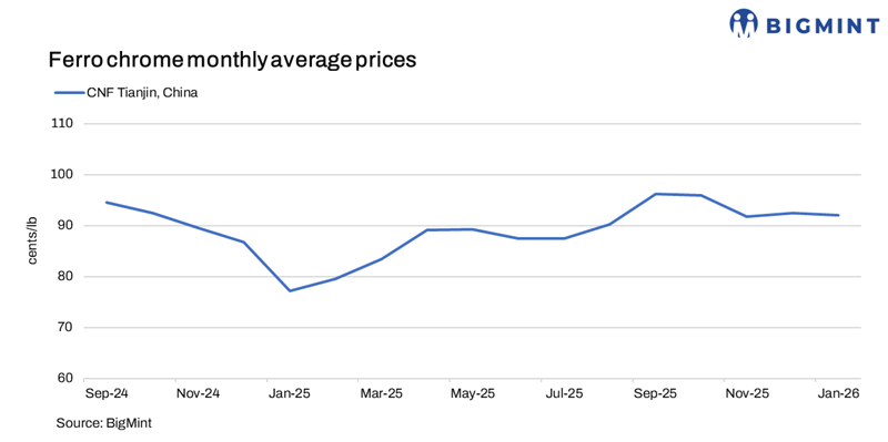 Indian ferro chrome export prices to China remained stable w-o-w at 92 cents/lb CNF on 7 Jan’26, supported by steady buying interest ahead of Lunar New Year restocking. Prices to Japan inched up by 2 cents/lb to 98 cents/lb CNF, though market sentiment remained bearish, tracking lower Indian prices. Export prices to South Korea held firm w-o-w at 94 cents/lb CNF.