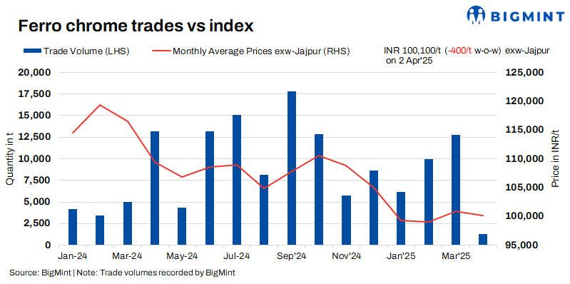 High-carbon ferro chrome (HC60%, Si:4%) prices were INR 100,100/t ($1,169/t) exw-Jajpur, as per BigMint’s assessment on 3 March. Around 5,000 t trades were recorded by BigMint last week within the price range of INR 99,000-104,500/t ($1,159-1,223/t) exw.