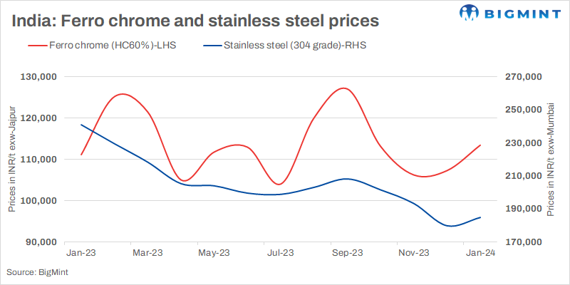As of 24 January, BigMint’s assessment revealed high-carbon ferro chrome (HC60%, Si:4%) prices at INR 117,900/t ($1,418/t) exw-Jajpur. Similarly, high-carbon low-silicon ferro chrome (HC 60%, Si: 2%) prices also climbed by INR 5,600/t ($67/t) w-o-w, reaching INR 126,100/t ($1,519/t) exw-Jajpur on 25 January.