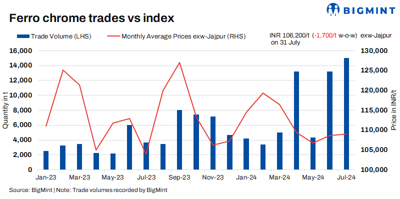 Domestic: As per BigMint’s assessment on 31 July, Indian HC ferro chrome (HC60%, Si:4%) prices were INR 106,200/t ($1,269/t) exw-Jajpur. The previous week saw conclusion of around 4,400 t of deals within the price bracket of INR 105,500-109,000/t ($1,260-1,302/t) exw.