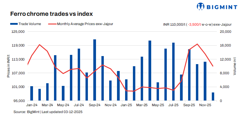 As per BigMint’s assessment on 3 December, high-carbon ferro chrome (HC 60%, Si: 4%) prices in India were INR 110,000/t ($1,220/t) exw-Jajpur. Around 2,200 t of deals were reported last week within the price range of INR 110,000-112,000/t ($1,220-1,242/t) exw.