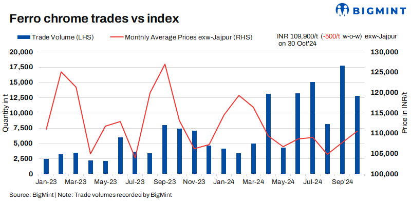 Indian high-carbon ferro chrome (HC60%, Si:4%) prices experienced a slight decline of INR 500/tonne (t) ($6/t) w-o-w to INR 109,900/t ($1,307/t) exw-Jajpur on 30 October as compared to INR 110,400/t ($1,313/t) on 23 October. Prices were largely stable amid limited demand, and regular trades were carried out at the ongoing market rates. Additionally, resistance was seen towards higher offers.