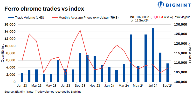 Domestic prices drop: As per BigMint’s assessment on 11 September, Indian high-carbon ferro chrome (HC60%, Si:4%) prices stood at INR 106,800/t ($1,272/t) exw-Jajpur. Trades of over 2,500 t were reported to BigMint last week within the price bracket of INR 106,600-109,000/t ($1,269-1,298/t) exw.