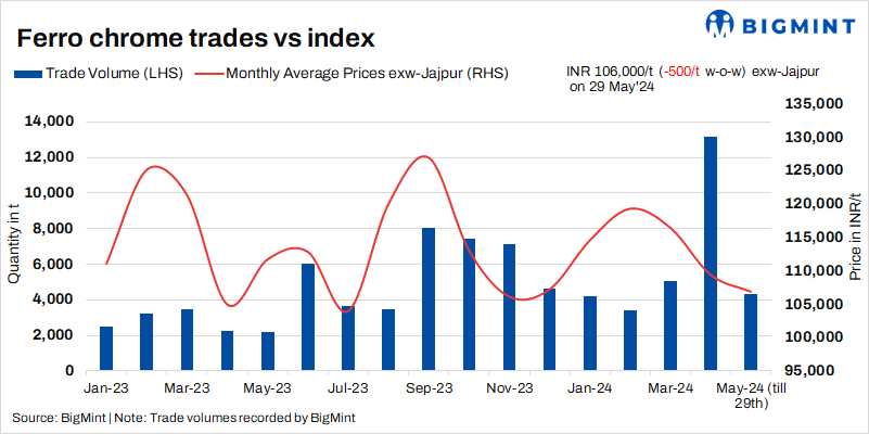 Prices of high-carbon ferro chrome (HC60%, Si:4%) were at INR 106,000/t ($1,271/t) exw-Jajpur, according to BigMint’s assessment on 29 May. Around 1,000 t of deals were concluded last week within the price bracket of INR 105,000-106,500/t ($1,259-1,277/t).
