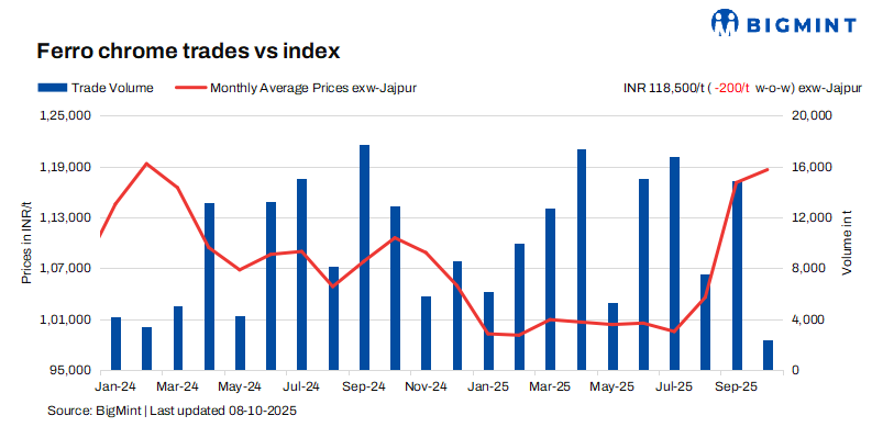 High-carbon ferro chrome (HC60%, Si:4%) prices in India stood at INR 118,500 /t ($1,335/t) exw-Jajpur, according to BigMint’s assessment on 8 October. Around 1,500 t was traded last week within the price range of INR 118,000-122,000/t ($1,329-1,374/t) exw.