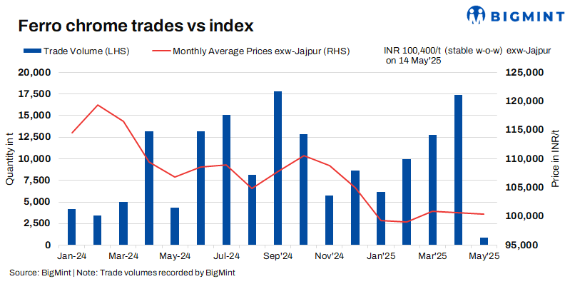 Limited supplies, trades support prices: Since the beginning of April 2025, prices have stayed largely range-bound, hovering in the range of INR 100,100-101,300/t ($1,168-1,182/t) exw. With limited demand and lesser bids from buyers, key sellers in the domestic market limited their supplies or stopped offering high-carbon ferro chrome (HC60%, Si:4%). One of the primary sellers reduced their monthly production numbers from around 40,000 t to 20,000 t recently.