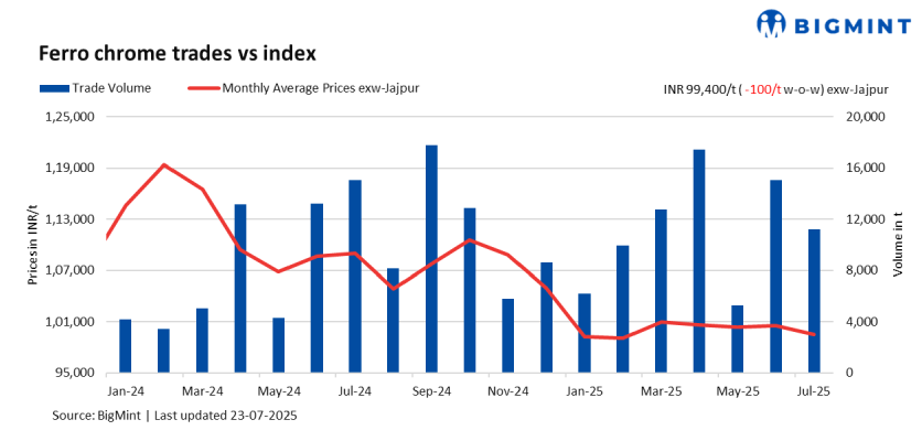 As per BigMint’s assessment on 23 July, high-carbon ferro chrome (HC60%, Si:4%) prices in India were at INR 99,400/t ($1,152/t) exw-Jajpur. Trades for around 2,200 t were concluded last week in the price range of INR 99,000-100,000/t ($1,148-1,159/t) exw.