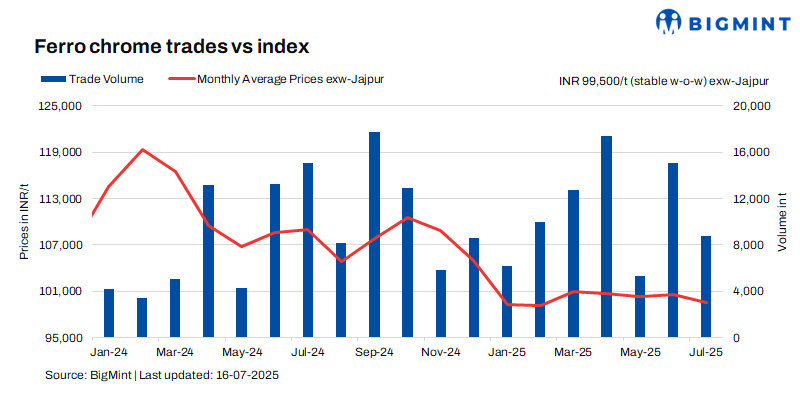 High-carbon ferro chrome (HC60%, Si:4%) prices in India were at INR 99,500/t ($1,158/t) exw-Jajpur, as per BigMint’s assessment on 16 July. Trades for approximately 2,000 t were reported last week in the price range of INR 99,500-100,000/t ($1,158-1,164/t) exw.