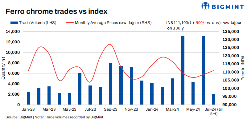 Domestic: High-carbon ferro chrome (HC60%, Si:4%) prices stood at INR 111,100/t ($1,330/t) exw-Jajpur on 3 July, as per BigMint’s assessment. In the price range of INR 110,600-112,600/t ($1,324-1,348/t) exw, around 3,100 t of trades were reported to BigMint in the previous week.