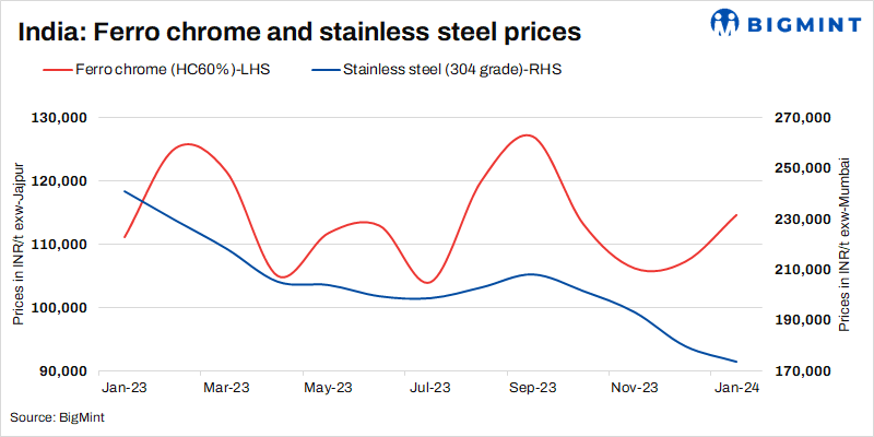 As of 31 January, BigMint’s assessment reported high-carbon ferro chrome (HC60%, Si:4%) prices at INR 118,500/t ($1,428/t) exw-Jajpur. Last week, around 1,000 t were transacted within the price range of INR 117,500-118,000/t ($1,418-$1,422/t). Conversely, high-carbon low-silicon ferrochrome (HC 60%, Si: 2%) prices declined by INR 1,000/t ($12/t) w-o-w, settling at INR 125,100/t ($1,508/t) exw-Jajpur on 1 February.