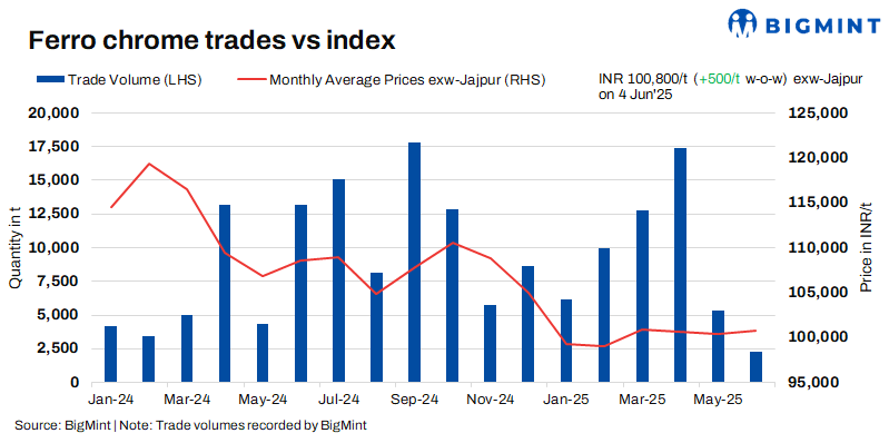 High-carbon ferro chrome (HC60%, Si:4%) prices in India were INR 100,800/t ($1,174/t) exw-Jajpur, as per BigMint’s assessment on 4 June. Around 2,700 t of trades were reported to BigMint last week within the price bracket of INR 100,000-102,000/t ($1,165-1,188/t) exw.