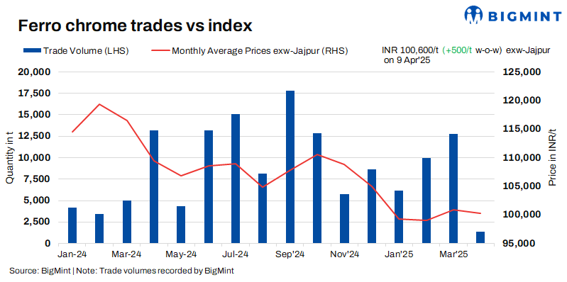 As per BigMint’s assessment on 9 April, high-carbon ferro chrome (HC60%, Si:4%) prices hovered at INR 100,600/t ($1,169/t) exw-Jajpur. Limited trades of around 200 t were finalised last week within the price range of INR 98,500-101,500/t ($1,145-1,180/t) exw.