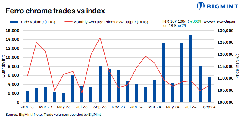 Domestic sector sees mixed trends: Indian high-carbon ferro chrome (HC60%, Si:4%) prices were at INR 107,100/t ($1,280/t) exw-Jajpur, up by a modest INR 300/t ($4/t) w-o-w, as per BigMint’s assessment on 18 September. Deals of around 400 t were concluded this week within the price bracket of INR 107,000-107,500/t ($1,279-1,285/t) exw.
