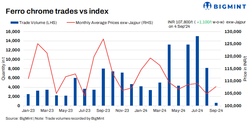 Uptrend in domestic prices: Indian high-carbon ferro chrome (HC60%, Si:4%) prices were at INR 107,800/t ($1,284/t) exw Jajpur, as per BigMint’s assessment on 4 September. Approximately 1,400 t of deals were finalised last week within the price range of INR 105,500-110,500/t ($1,256-1,316/t) exw.
