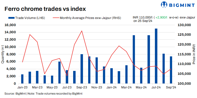 Uptrend in domestic prices: Indian high-carbon ferro chrome (HC60%, Si:4%) prices were INR 110,000/t ($1,314/t) exw-Jajpur, as per BigMint’s assessment on 25 September. Approximately 500 t of spot market deals were reported last week in the price range of INR 109,000-111,000/t ($1,303-1,326/t) exw. Prices have risen to over two months high as these levels were last seen in mid-July, 2024, as per data maintained with BigMint.