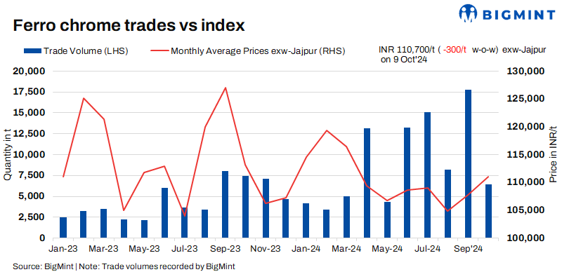 Domestic prices inch down: Indian high-carbon ferro chrome (HC60%, Si:4%) prices stood at INR 110,700/t ($1,318/t) exw-Jajpur, as per BigMint’s assessment on 9 October. Last week, trades of around 3,000 t were recorded by BigMint in the price range of INR 110,000-111,000/t ($1,310-1,322/t) exw.