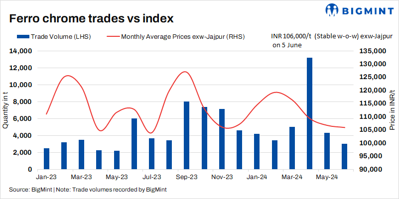 High-carbon ferro chrome (HC60%, Si:4%) prices stood at INR 106,000/t ($1,270/t) exw-Jajpur on 5 June, according to BigMint’s assessment. Last week, around 3,000 t of trades were concluded in the range of INR 104,000-107,000/t ($1,246-1,282/t).