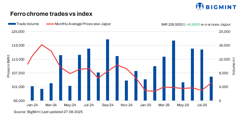High-carbon ferro chrome (HC60%, Si:4%) prices in India were INR 109,500/t ($1,249/t) exw-Jajpur, as per BigMint’s assessment on 27 August. Around 2,000 t of deals were reported last week in the price bracket of INR 104,000-112,000/t ($1,187-1,278/t) exw.