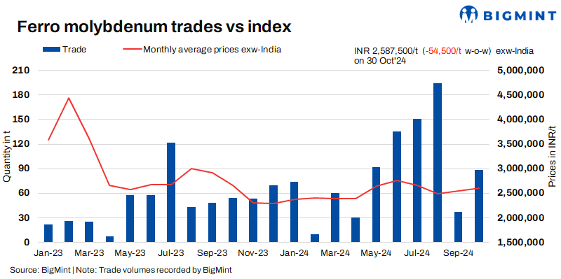 As per BigMint’s assessment on 30 October, ferro molybdenum in India stood at INR 2,587,500/t ($30,773/t) exw on a 60% pro rata basis. Deals of around 6 tonne (t) were recorded in the price range of INR 2,555,000-2,615,000/t ($30,387-31,100/t) exw.
