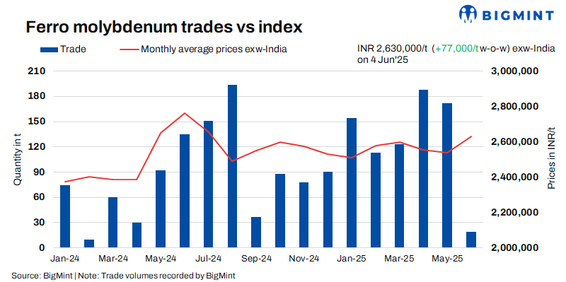 Indian ferro molybdenum prices witnessed an increase of INR 77,000/t ($896/t) as compared to the last assessment on 28 May 2025. Prices increased as demand picked up both in the global and domestic markets.