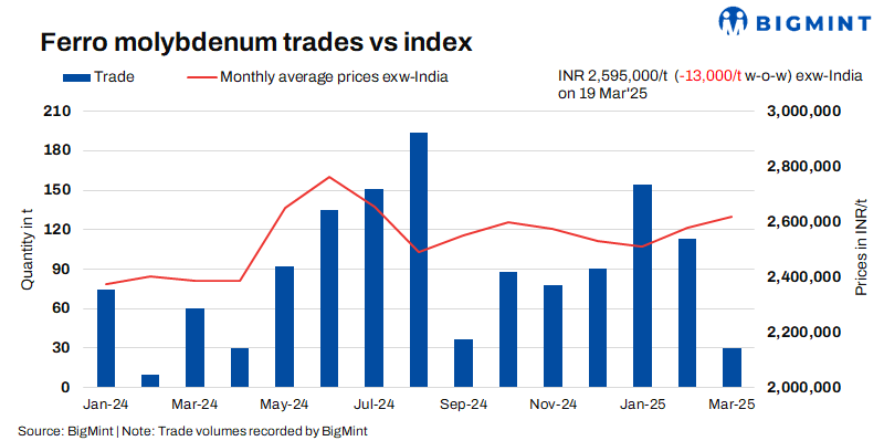 Ferro molybdenum prices in India were at INR 2,595,000/t ($29,997/t) exw-India, as per BigMint’s assessment on 19 March.