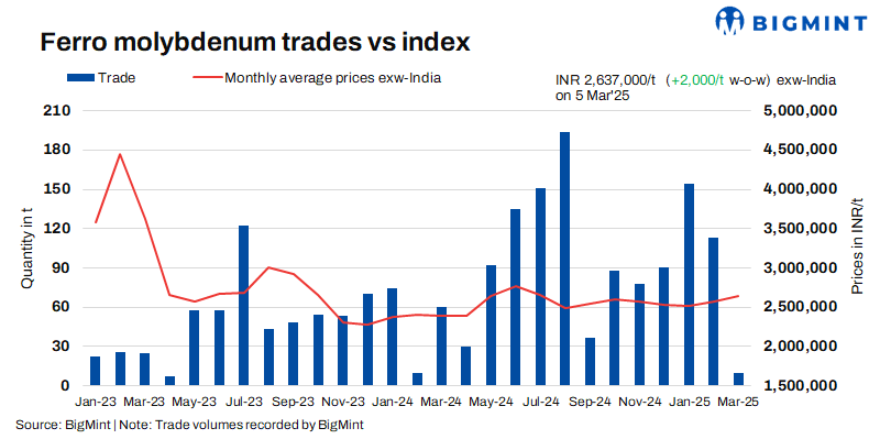 As per BigMint’s assessment on 5 March, ferro molybdenum prices in India were at INR 2,637,000/t ($30,276/t) exw. Deals for approximately 20 t were recorded by BigMint last week, within the price bracket of INR 2,560,000-2,640,000/t ($29,392-30,310/t) exw.