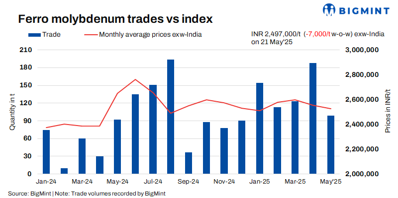 As per BigMint’s assessment on 21 May, ferro molybdenum prices in India were at INR 2,497,000/t ($29,191/t) exw. Deals for around 42 t were recorded by BigMint in the assessment window in the price bracket of INR 2,490,000-2,540,000/t ($29,109-29,693/t) exw.