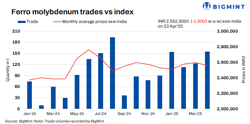 As per BigMint’s assessment on 23 April, ferro molybdenum prices in India were INR 2,552,000/t ($29,857/t) exw-India. Around 32 t of trades were heard last week within a price bracket of INR 2,495,000-2,575,000/t ($29,190-30,126/t) exw.