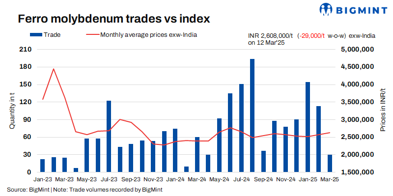 Ferro molybdenum prices in India were INR 2,608,000/t ($29,900/t) exw-India, as per BigMint’s assessment on 12 March. Approximately 20 t of trades were concluded last week in the price range of INR 2,535,000-2,615,000/t ($29,064-29,981/t) exw.
