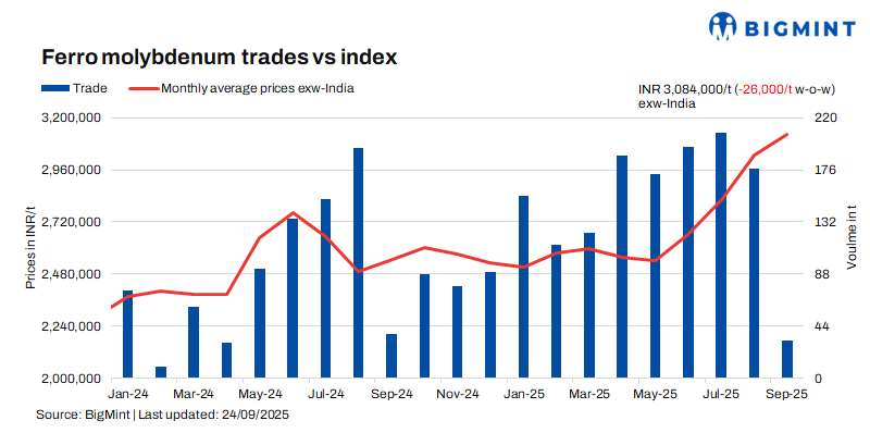 As per BigMint’s assessment on 24 September, ferro molybdenum prices in India were INR 3,084,000/t ($34,744/t) exw-India. Around 15 t of deals were reported to BigMint last week within the price bracket of INR 3,050,000-3,150,000/t ($34,361-35,488/t) exw.