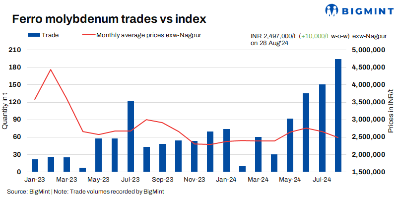 As per BigMint’s assessment on 28 August, the price of ferro molybdenum in India stood at INR 2,497,000/t ($29,741/t) on a 60% pro rata basis, ex-works Nagpur. During the past week, approximately 60 t of deals were concluded within the price range of INR 2,400,000-2,565,000/t ($28,586-30,551/t) ex-works.