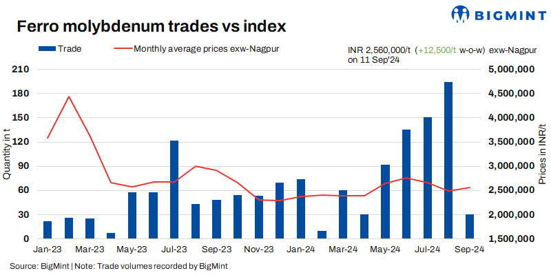 As per BigMint’s assessment on 11 September, ferro molybdenum prices in India were INR 2,560,000/t ($30,492/t) exw-Nagpur on a 60% pro-rata basis. Trades of approximately 30 t were reported to BigMint last week in the price range of INR 2,450,000-2,575,000/t ($29,181-30,670/t) exw.