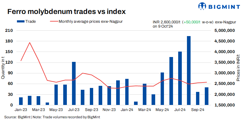 Indian ferro molybdenum prices rose by INR 50,000/tonnes ($595/t) w-o-w compared to the previous assessment on 1 October, driven by key global factors such as China’s stimulus measures and geopolitical tensions.