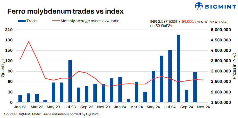 As per BigMint’s assessment on 6 November, ferro molybdenum in India stood at INR 2,600,000/t ($30,868/t) exw on a 60% pro rata basis. Trading activity remained slow due to ongoing festivities.