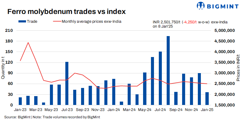 As per BigMint’s assessment on 8 January, ferro molybdenum prices in India were INR 2,501,750/t ($29,141/t) exw-India. Around 40 t of deals were reported to BigMint last week within the price range of INR 2,512,000-2,530,000/t ($29,261-29,470/t) exw.