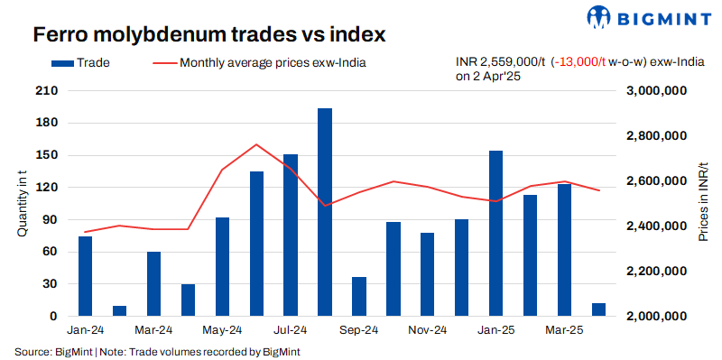 Ferro molybdenum prices in India were at INR 2,559,000/t ($29,935/t) exw-India, as per BigMint’s assessment on 2 April. Approximately, 25 tonnes (t) of trades were reported to BigMint last week within the price range of INR 2,545,000-2,580,000/t ($29,771-30,180/t) exw.