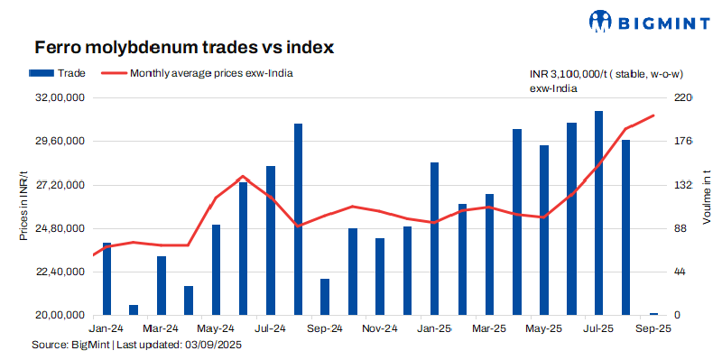As per BigMint’s assessment on 3 September, ferro molybdenum prices in India were at INR 3,100,000/t ($35,205/t) exw.