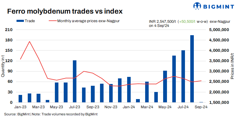 As of 4 September, BigMint’s assessment indicates that ferro molybdenum prices in India stood at INR 2,547,500/t ($30,341/t) on an ex-works Nagpur basis, calculated on a 60% pro rata basis. Smaller quantity trades were reported within the range of INR 2,520,000-2,530,000/t ($30,013-30,132/t) exw last week.