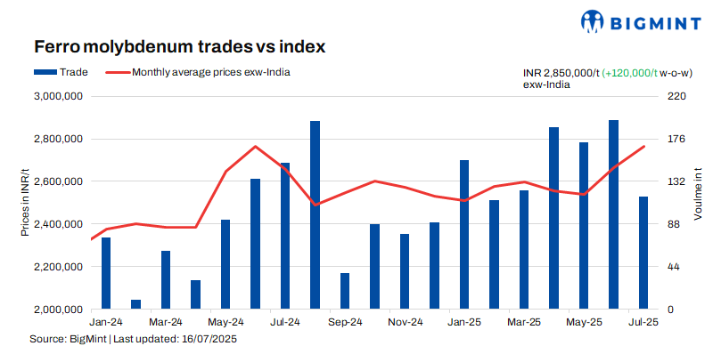 Ferro molybdenum prices in India were assessed at INR 2,850,000/t ($33,168/t) exw-India, as per BigMint’s assessment on 16 July. Around 55 t of deals were concluded last week in the price range of INR 2,785,000-2,850,000/t ($32,411-33,168/t) exw.